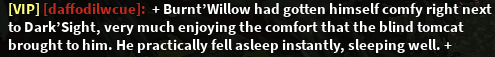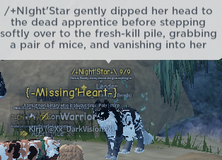 • A majority of the dialog here was specifically extracted from a Warrior Cats roleplay game on ROBLOX. The rest of it was Other ROBLOX Games That I Do Not Remember. There was originally supposed to be more than just ROBLOX chat messages in the script, but I found so much material from there alone that I deemed anything else unnecessary. Functionally, I didn't think it would make much of a difference to diversify the game selection, even if it would have technically been more true to the initial concept. The end result was the same at its core; I was given a series of dialog fragments with no context, and able to rearrange them into a dreamlike sequence of uncanny near-nonsense, its meaning entirely in the eye of the beholder.